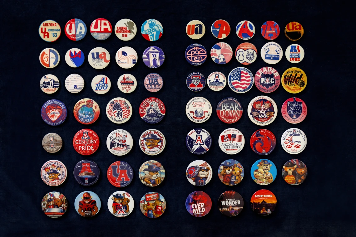 Homecoming buttons through the years.